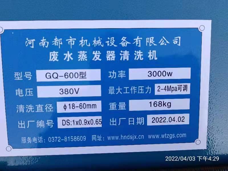 2022年4月1日,衡水酷祥生物科技有限公司糠醛廠(原河北省衡水誠(chéng)碩化工有限公司),在王總的精心安排下,韓總,張主任,全廠職工共同努力配合河南都市機(jī)械設(shè)備有限公司喬主任,發(fā)明了一項(xiàng)新的工具,使用兩臺(tái)GQ—600型智能清洗機(jī)鉆洗管子內(nèi)徑40毫米長(zhǎng)度5米1800根結(jié)垢堅(jiān)硬,徹底堵死,好久沒(méi)有通透過(guò)的1000平方廢水蒸發(fā)器,為糠醛行業(yè)開辟了新的道路。歡迎大家關(guān)注分享指導(dǎo)合作共贏!