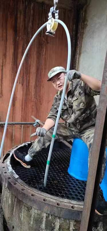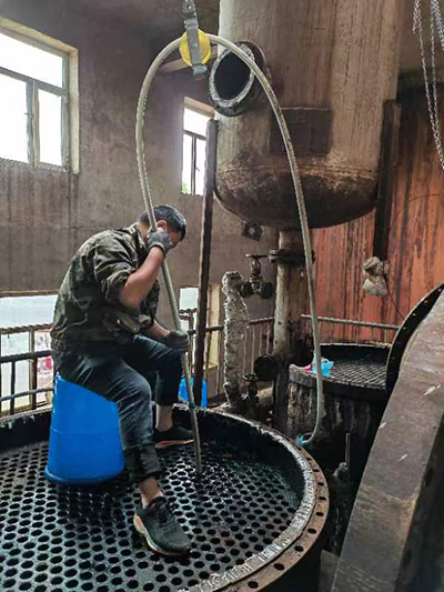 2022年5月28日黑龍江省哈爾濱市呼蘭區(qū)康金鎮(zhèn)小趙村哈爾濱市盛大化工有限公司在費總的精心安排下,孫總親自坐鎮(zhèn)指導,生產廠長潘峰與河南都市機械設備有限公司喬主任,都紅植技師密切配合,徹底了解GQ-600型智能清洗機的性能和特點,使用600型智能清洗機四個要點1,不能缺水,要使用干凈的靜水,2,過載保護扭力限制器要調到,軟軸跳動可以自動停下來,不然既不安全,又失去他的意義,3,軟軸要放平拉直,順勁擺放,不能打死彎,盡可能防止扭軸斷軸,4,鉆頭要大小適當,太大了容易卡軸扭軸斷軸,并且一定要直對疏通管道口。三天時間打通清洗了兩臺徹底堵死好、結垢堅硬的污水蒸發(fā)器,廢水蒸發(fā)器,沒有損壞一根軟軸,沒有損壞一個鉆頭和配件,為糠醛行業(yè)增加了自信,減少了資金損耗,降低成本,提益,做出了標桿!